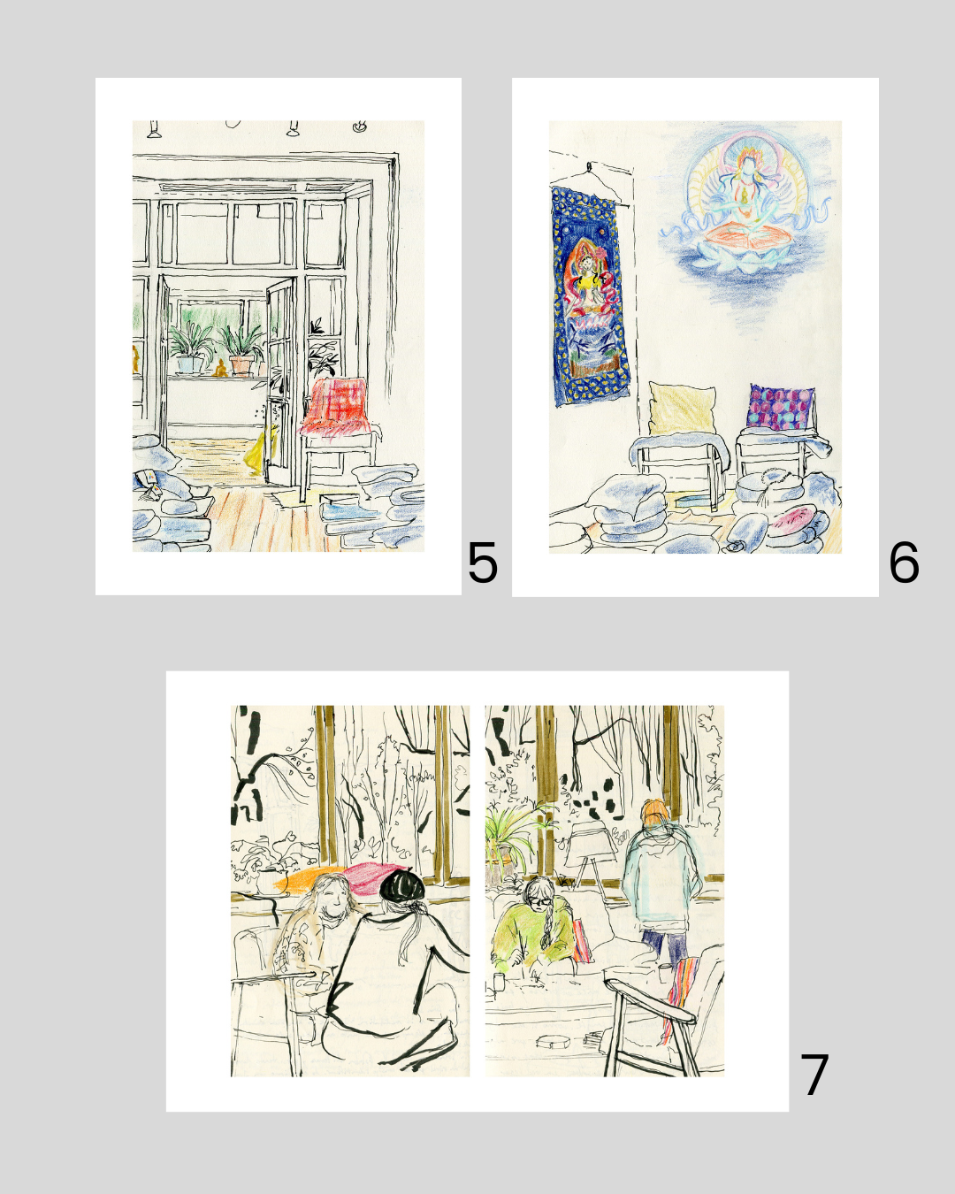ABOVE: 5. Shrine Room. 6. Vision of Vajrasattva in the shrine room. 7. Artmaking in the lounge.